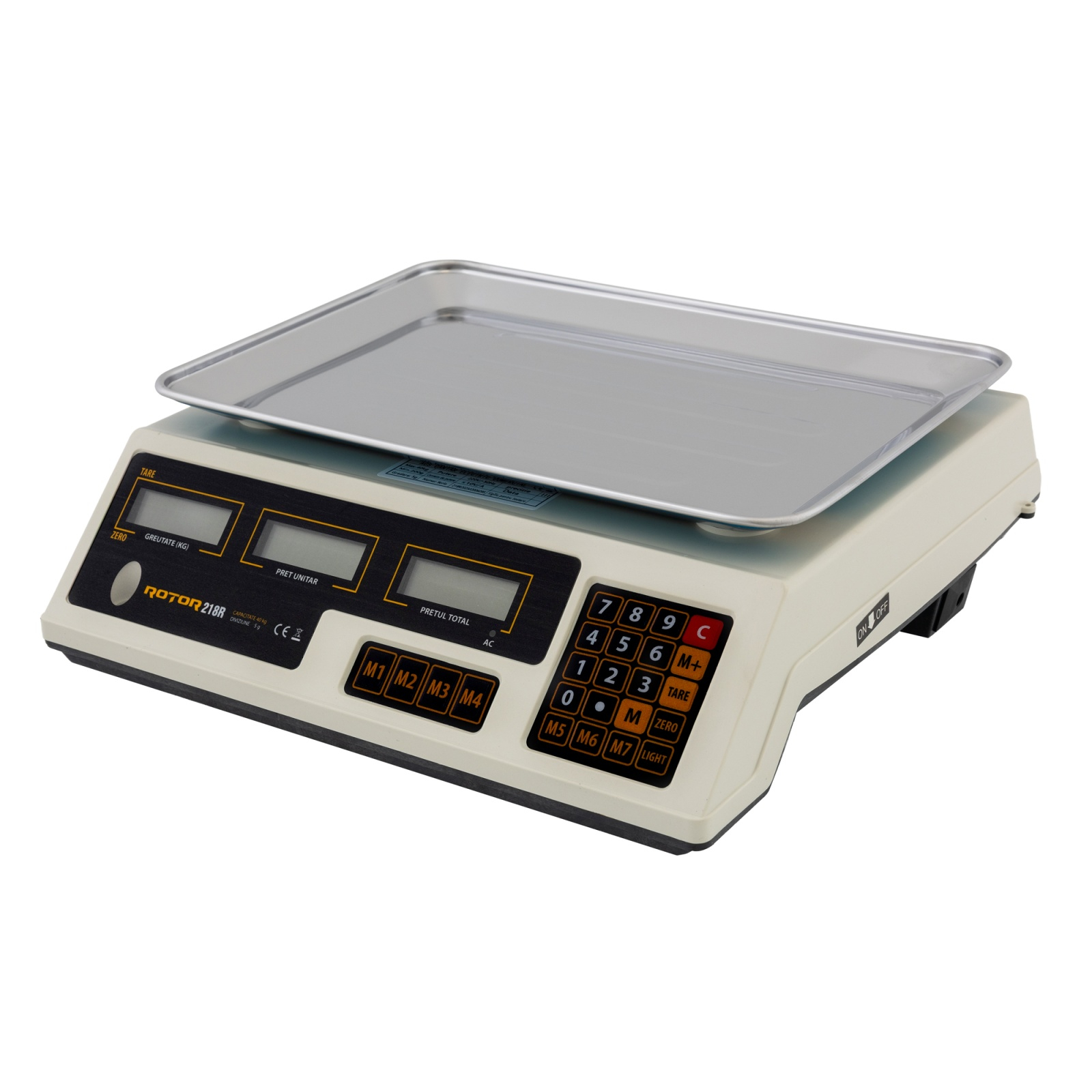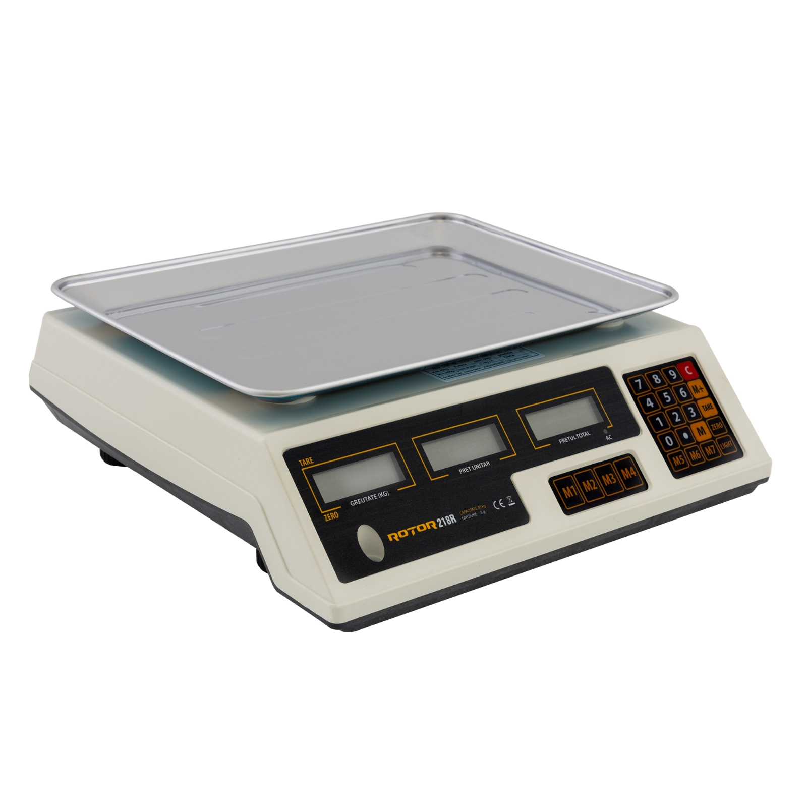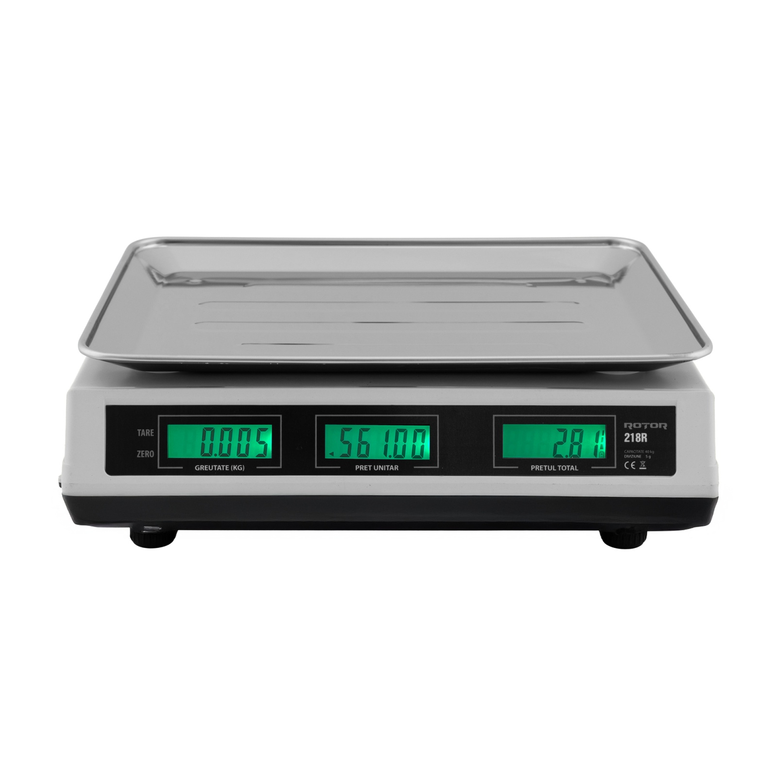 R218 Cântar electric cu baterie reîncărcabilă ROTOR Ai un stand de legume, un food-truck sau un punct de vânzare aglomerat? Atunci știi cât de important e ca fiecare cântărire să fie rapidă, precisă și vizibilă pentru toată lumea. ROTOR R218B este un cântar electronic comercial de bancă gândit exact pentru nevoile tale – compact, stabil, cu afișaj dual și baterie proprie care îți oferă până la 60 de ore de autonomie. Echipat cu o platformă din inox de 30 × 24 cm și o celulă de sarcină de înaltă precizie, acest model suportă până la 40 kg, cu o diviziune de 5 g – ideal pentru vânzări corecte și evitarea penalizărilor. Trei afișaje LED verzi (pentru greutate, preț unitar și total) sunt poziționate atât pentru operator, cât și pentru client, oferind transparență totală în timpul tranzacției. Tastatura numerică este rezistentă la stropi și permite memorarea a până la 7 prețuri presetate (M1-M7) – perfect pentru produse frecvente. Tastele Tare, Zero și Add accelerează fluxul de lucru, permițând resetarea și calculul rapid al sumelor pentru inventar. Cântarul funcționează autonom datorită bateriei interne de 4 V / 4 Ah, iar când nivelul scade, un indicator luminos te avertizează. Încărcarea completă se face în aproximativ 6 ore, direct cu adaptorul inclus, fără a scoate acumulatorul. Carcasa ABS ranforsat rezistă la șocuri, praf și grăsimi alimentare, în timp ce picioarele reglabile cu cauciuc antiderapant mențin cântarul perfect stabil pe orice blat lucios. Cântarul cântărește doar 3,5 kg, fiind ușor de mutat oriunde ai nevoie. Platforma din inox este detașabilă și ușor de curățat, ceea ce îl face potrivit și pentru aplicații în care igiena este esențială. Ideal pentru piețe, măcelării, brutării, farmacii veterinare sau standuri temporare, ROTOR R218B este alegerea perfectă pentru cine vrea un cântar electronic de încredere, mobil și precis. Caracteristici tehnice: - Memorare: 7 prețuri - Precizie: 1/3000 f.s. - Greutate suportată: 40 kg - Funcție: Oprire automată - Alimentare: AC 220V/~50Hz și baterie reîncărcabilă incorporată Conținut pachet: - Cântar electronic ROTOR R218B cu acumulator instalat - Tavă inox alimentară - Adaptor de încărcare 230 V - Manual de utilizare