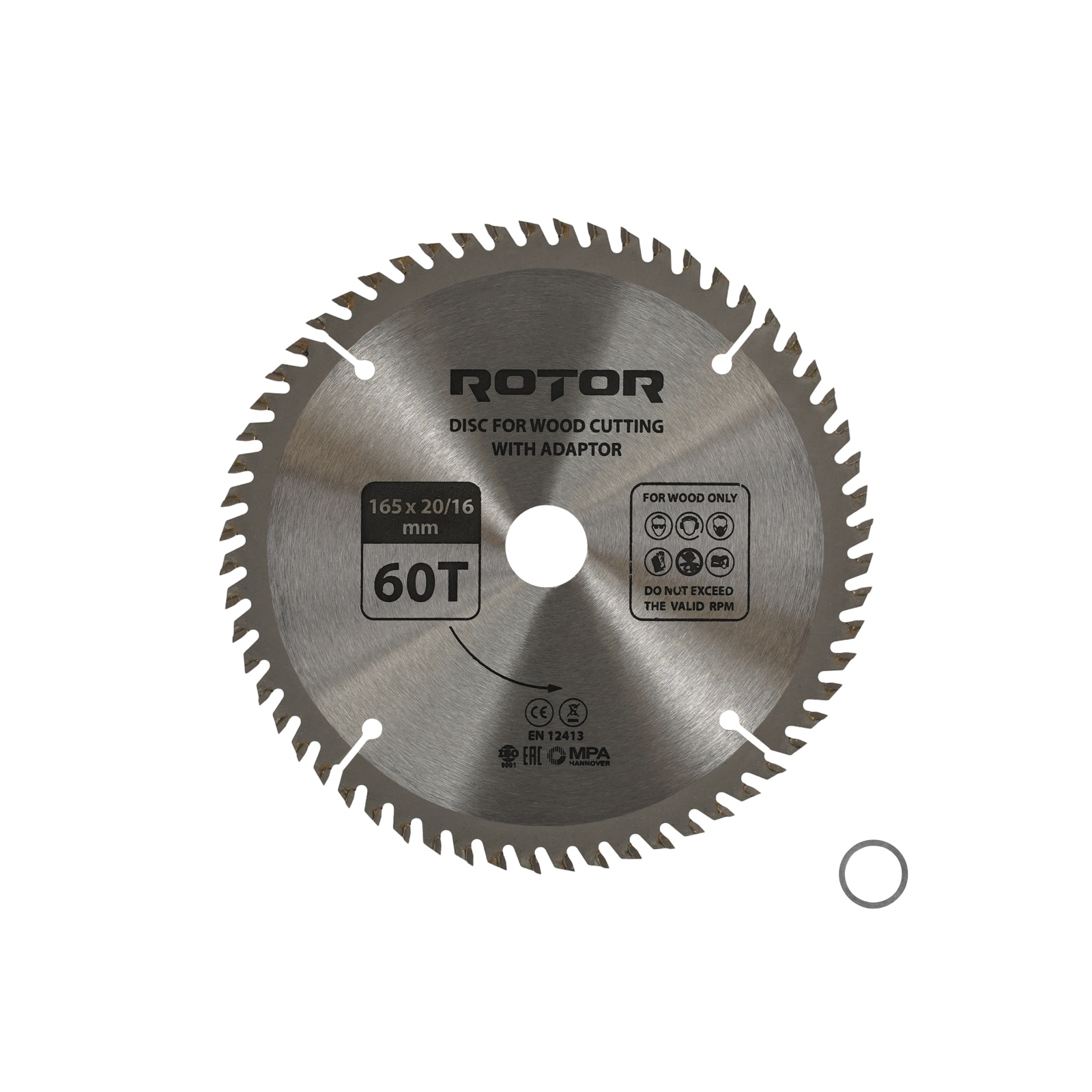 Disc de tăiat lemn 165*20/16 cu adaptor 60T ROTOR Diametru exterior: 165 mm Diametru interior: 20 mm (cu adaptor pentru 16 mm) Număr dinți: 60T Material: Oțel de înaltă calitate cu dinți din carbură de tungsten (TCT) Utilizare: Lemn masiv, PAL, MDF, placaj, materiale lemnoase compozite Compatibilitate: Fierăstraie circulare cu prindere de 16 mm sau 20 mm Avantaje: Tăiere foarte fină și precisă datorită numărului mare de dinți Durabilitate ridicată datorită dinților din carbură de tungsten Versatilitate – potrivit pentru diverse tipuri de lemn și materiale derivate Adaptor inclus , compatibil cu mai multe tipuri de scule electrice