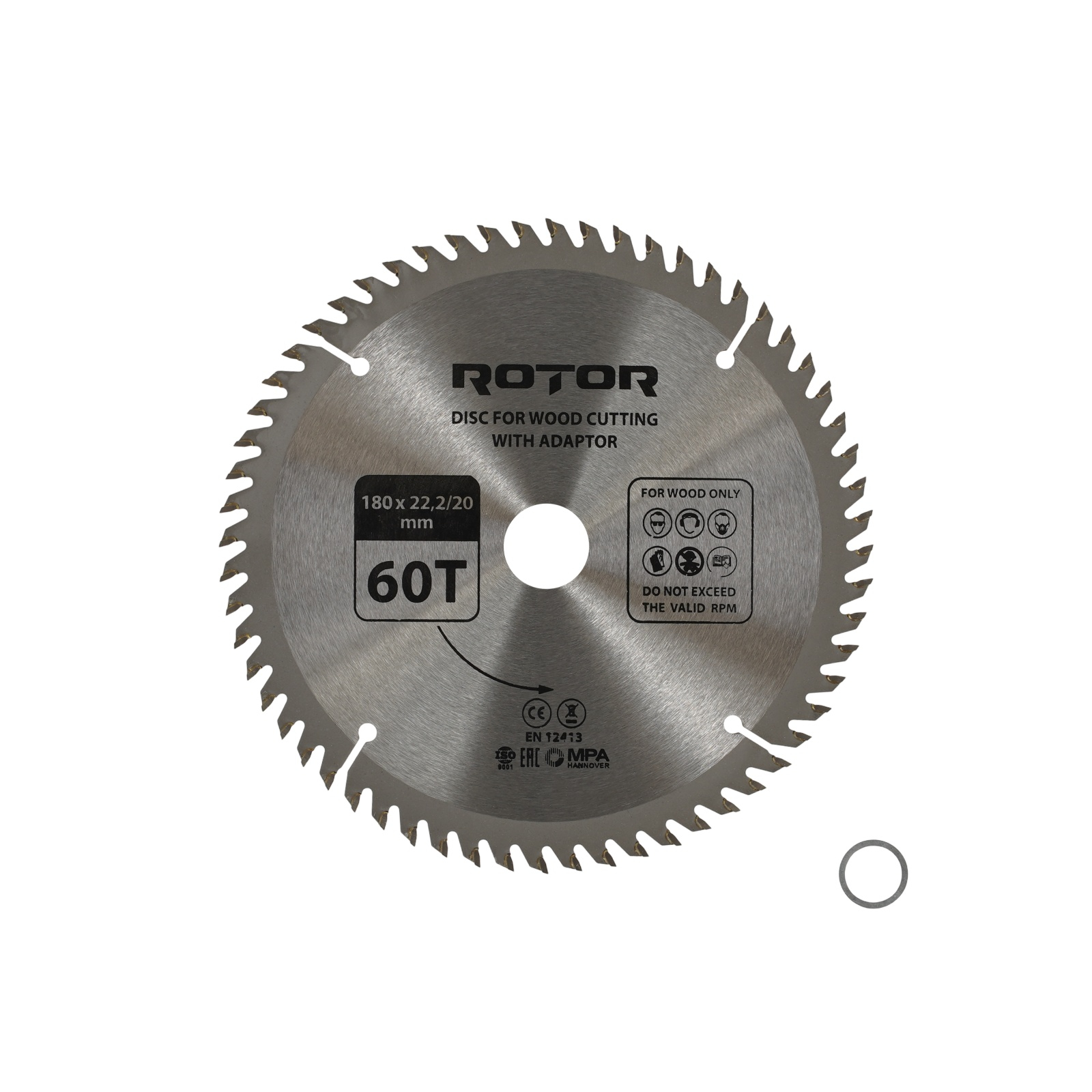 Disc de tăiat lemn 180*22,2/20 cu adaptor 60T ROTOR Diametru exterior: 180mm Diametru interior: 20 mm (cu adaptor pentru 16 mm) Număr dinți: 60T Material: Oțel de înaltă calitate cu dinți din carbură de tungsten (TCT) Utilizare: Lemn masiv, PAL, MDF, placaj, materiale lemnoase compozite Compatibilitate: Fierăstraie circulare cu prindere de 16 mm sau 20 mm Avantaje: Tăiere foarte fină și precisă datorită numărului mare de dinți Durabilitate ridicată datorită dinților din carbură de tungsten Versatilitate – potrivit pentru diverse tipuri de lemn și materiale derivate Adaptor inclus , compatibil cu mai multe tipuri de scule electrice