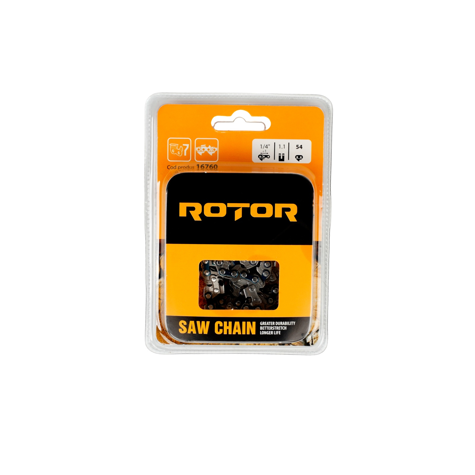 Lanț drujbă 10″/25 cm 1/4 1.1 mm 54T ROTOR Lanțul ROTOR 10″/25 cm, 54T este proiectat pentru drujbele electrice și pe acumulator de capacitate medie, oferind o combinație excelentă între putere, precizie și durabilitate. Cu 27 de dinți de tăiere și 54 pinteni , lanțul garantează o performanță constantă și o tăiere uniformă. Datorită construcției sale din oțel tratat, lanțul rezistă în timp, chiar și în cazul tăierilor intense. Pasul de 1/4” și grosimea de 1,1 mm asigură o tăiere lină, cu vibrații minime, protejând lama și motorul drujbei. Este alegerea perfectă pentru tăierea buștenilor, crengilor sau lemnului de foc. Detalii tehnice: Pas lanț: 1/4” Număr dinți: 27 Număr pinteni: 54 Grosime: 1,1 mm Lungime lamă compatibilă: 10” / 25 cm