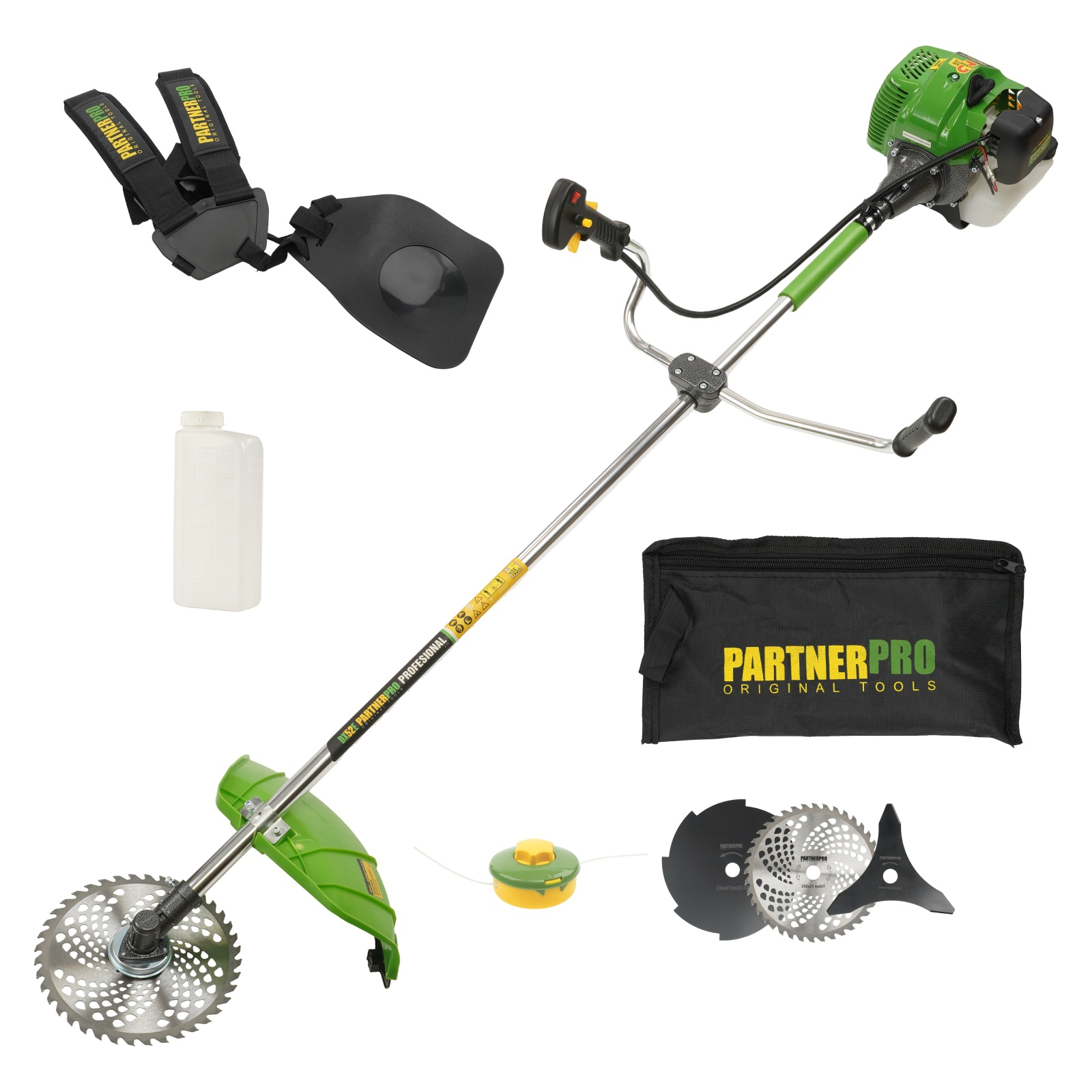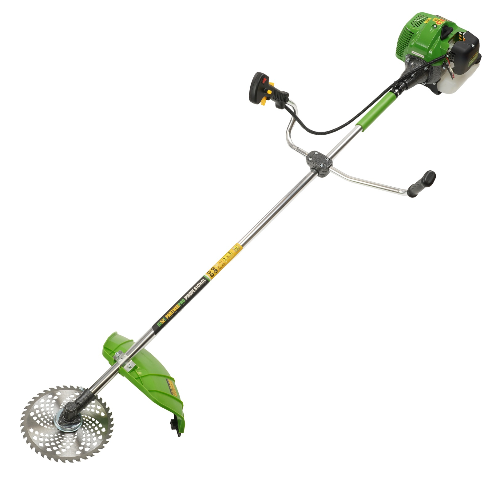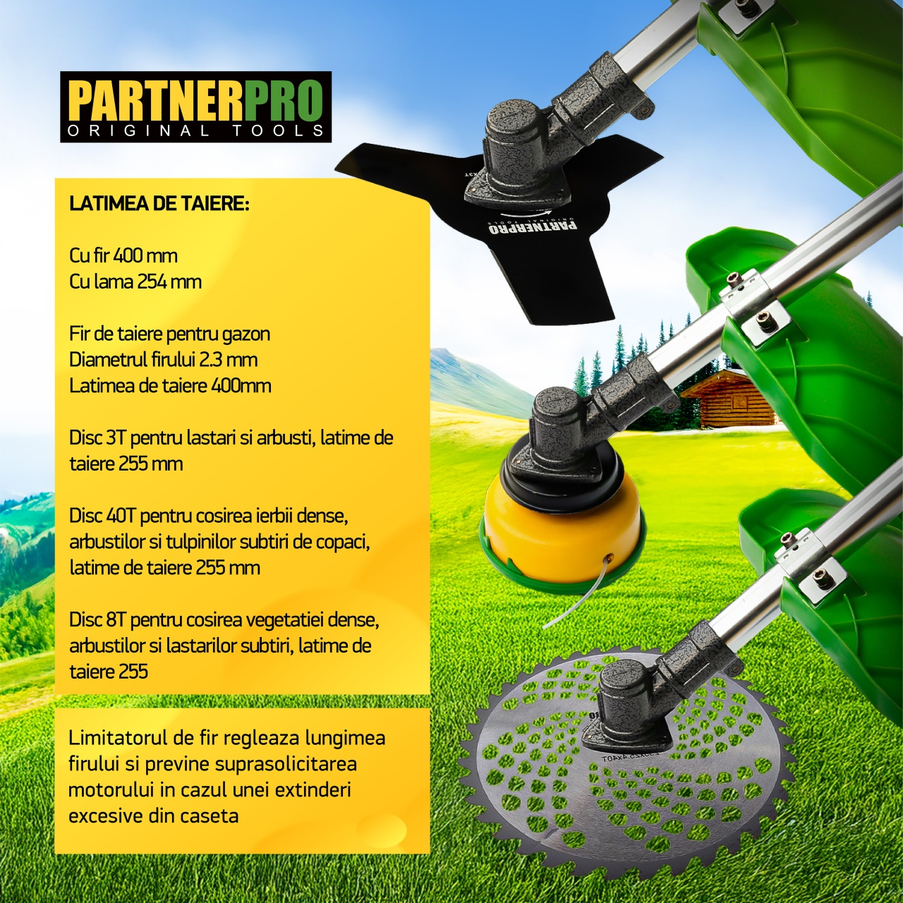 Motocoasa pe benzină PARTNERPRO DX52E PartnerPro DX52E este o trimmer pe benzină pe benzină eficientă, potrivită pentru cei care au nevoie de o unealtă de încredere pentru întreținerea peluzei, curățarea buruienilor, a ierbii înalte sau a arbuștilor. Cu un motor robust de 5.5 CP și o putere totală de 5200W, această trimmer pe benzină se descurcă excelent cu ușurință lucrărilor solicitante din gospodărie, grădină sau pe terenuri agricole. Este o unealtă profesională rezistentă și durabilă, echipată cu tot ce ai nevoie pentru o utilizare practică și sigură. Dotată cu sistem anti-vibrații, mâner ergonomic, ham dublu pentru susținere și demaror manual cu aprindere fără contact, PartnerPro DX52E îți oferă manevrabilitate excelentă și confort în utilizare. Este o alegere excelentă atât pentru lucrări de uz cotidian, cât și pentru sarcini mai complexe, fiind potrivită pentru utilizatori casnici sau profesioniști în întreținerea spațiilor verzi. Detalii Tehnice: Motor robust: 5.5 CP / 5200W Tip motor: 2 timpi, 52CC Turație: 9000 rot/min Rezervor combustibil: 1.2 litri Aprindere fără contact, demaror manual Filtru de aer: protejează motorul și prelungește durata de viață Reductor durabil pentru utilizare intensă Sistem anti-vibrații cu cruce de îmbinare Latime de tăiere cu fir: 400 mm Latime de tăiere cu disc: 254 mm Fir de tăiere: Ø 2.3 mm Disc 3T: tăiere lăstari și arbuști, 255 mm Disc 40T: cosirea ierburilor dense, 255 mm Disc 8T: vegetație densă și lăstari, 255 mm Limitator de fir: previne suprasolicitarea motorului Parghie de siguranță împotriva pornirii accidentale Mâner ergonomic cu control ușor Conținut pachet: Motocoasa PartnerPro DX52E Cap mosor cu fir Disc metalic 3T Disc tip vidia 40T Ham dublu pentru susținere confortabilă Bidon pentru amestec carburant Set de echipamente pentru întreținere și montaj Manual de utilizare - Ham dublu