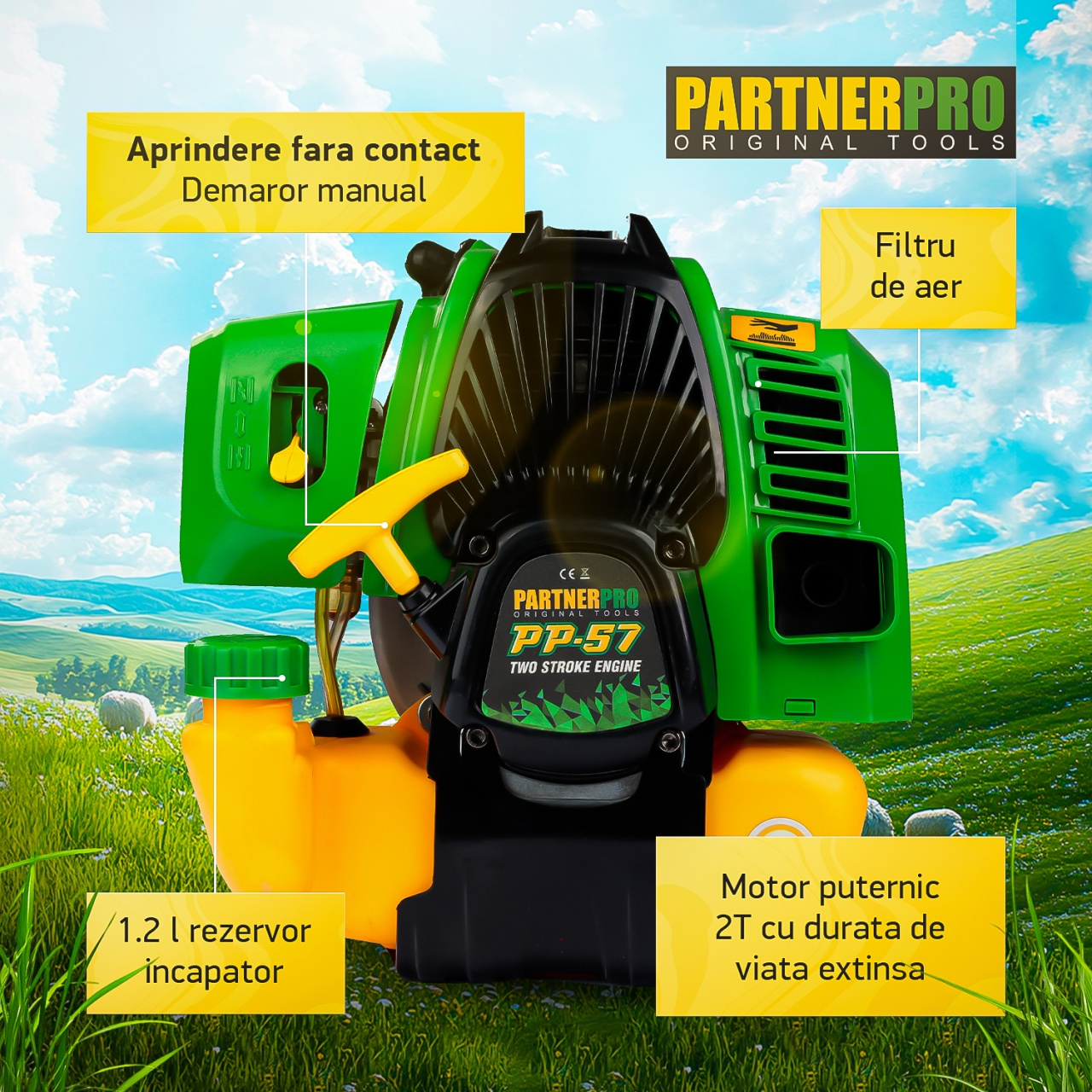 Motocoasa pe benzină PARTNERPRO PP-57 Motocoasa pe benzină PartnerPro PP-57 este o soluție excelentă pentru lucrări intense de întreținere a grădinii, curățarea terenurilor sau tunderea vegetației dense. Echipată cu un motor de 6 CP și o putere de 5700W, această unealtă este ideală pentru utilizatori care caută randament maxim și durabilitate în timp. Turația de 10.000 rotații pe minut permite o tăiere eficientă și rapidă, chiar și în condiții dificile. PartnerPro PP-57 este construită pentru a rezista – cu materiale rezistente, mâner ergonomic, ham dublu pentru susținere corectă și sistem anti-vibrații pentru confort sporit în timpul lucrului. Recomandată pentru utilizare domestică sau semi-profesională, această motocoasă pe benzină se adaptează cu ușurință diverselor sarcini – de la cosirea ierbii până la tăierea arbuștilor. Detalii Tehnice: Putere motor: 6 CP / 5700W Motor în 2 timpi, cilindree 52CC Turație maximă: 10.000 rot/min Rezervor combustibil: 1.2 litri, pentru utilizare extinsă Aprindere fără contact și demaror manual pentru pornire ușoară Filtru de aer: protejează motorul de impurități Mâner de control ergonomic Ham dublu pentru distribuirea uniformă a greutății Reductor rezistent pentru utilizare pe termen lung Cruce de îmbinare: reduce vibrațiile și crește stabilitatea Sistem de protecție pentru utilizare sigură Latime de tăiere cu fir: 400 mm Latime de tăiere cu lamă: 254 mm Fir tăiere: Ø 2.3 mm Disc 3T pentru arbuști și lăstari: 255 mm Disc vidia 40T pentru vegetație densă: 255 mm Limitator de fir: previne uzura motorului Conținut pachet: Motocoasa PartnerPro PP-57 1x Disc metalic 3T 1x Disc vidia 40T pentru tăiere avansată 1x Cap mosor cu fir 1x Ham dublu pentru susținere confortabilă 1x Set de unelte pentru întreținere 1x Bidon pentru amestec carburant Manual de utilizare