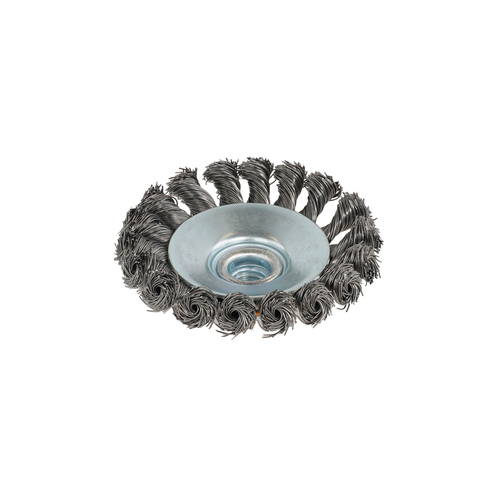 Perie de Sârmă Conică cu Noduri 100 mm M14 din Oțel ROTOR Peria de sârmă conică cu noduri ROTOR 100 mm M14 din oțel este perfectă pentru curățarea și îndepărtarea ruginii, vopselei vechi, oxizilor și altor impurități de pe suprafețe metalice, beton, lemn sau piatră. Forma conică, combinată cu nodurile răsucite, oferă un control excelent în timpul utilizării, iar dimensiunea de 100 mm permite o curățare eficientă chiar și în colțuri și unghiuri greu accesibile. Caracteristici tehnice: Diametru: 100 mm Tip de fixare: M14 (filet standard pentru prinderea pe șlefuitoare unghiulare) Material: Oțel de înaltă calitate Formă: Conică cu noduri răsucite Utilizare: Curățare, îndepărtarea ruginii, vopselei, oxizilor și altor impurități de pe suprafețe metalice, lemn, beton, piatră Compatibilitate: Șlefuitoare unghiulare cu filet M14 Această perie de sârmă este ideală pentru lucrările care necesită o curățare detaliată și eficientă pe suprafețe de dimensiuni medii sau mici.