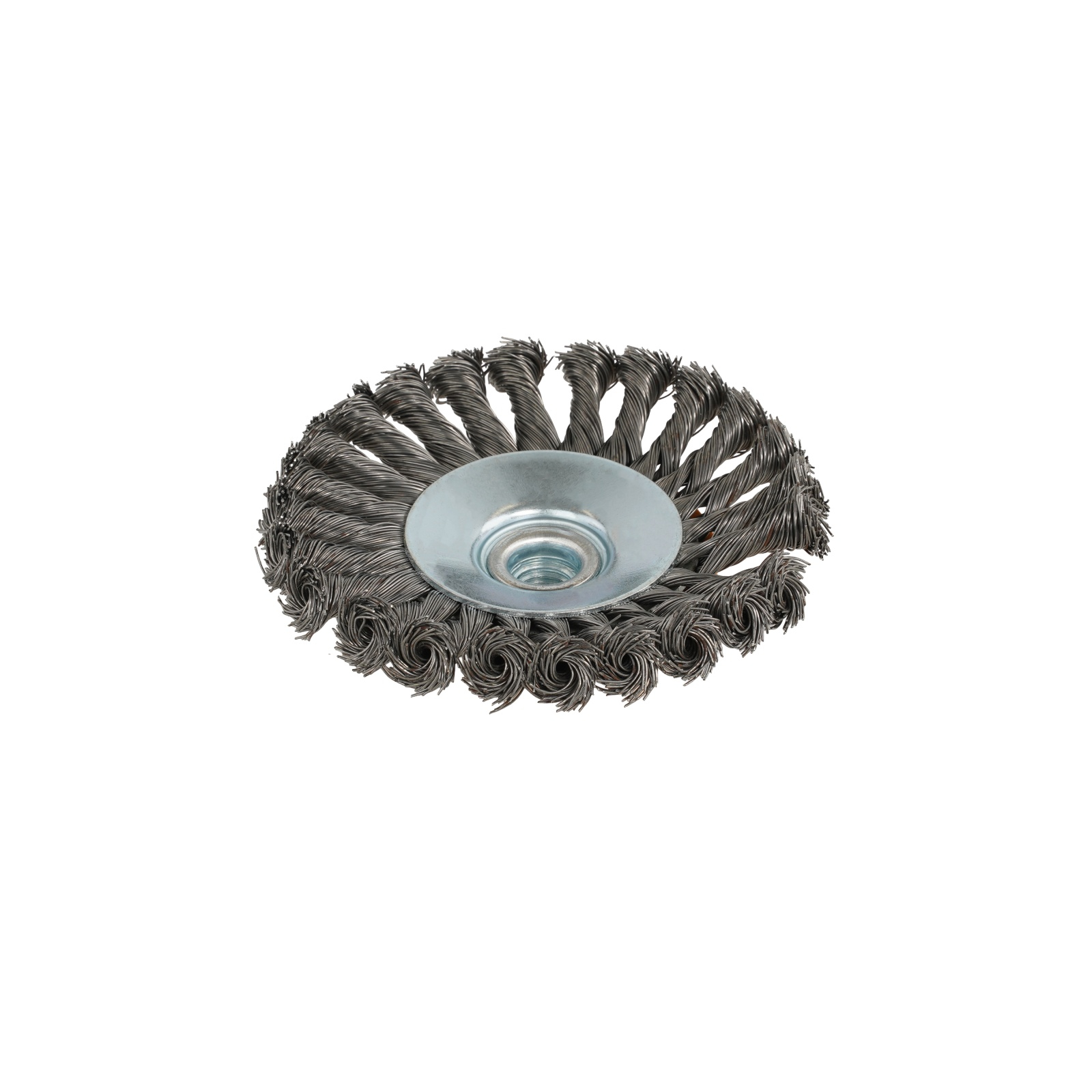 Perie de Sârmă Conică cu Noduri 125 mm M14 din Oțel ROTOR Peria de sârmă conică cu noduri ROTOR 125 mm M14 din oțel este un instrument de curățare puternic și eficient, ideal pentru îndepărtarea ruginii, vopselei vechi, oxizilor și altor impurități de pe suprafețe metalice, beton, lemn sau piatră. Datorită formei conice și nodurilor răsucite, această perie oferă un control excelent în colțuri și unghiuri greu accesibile, fiind perfectă pentru lucrări detaliate și de curățare agresivă. Caracteristici tehnice: Diametru: 125 mm Tip de fixare: M14 (filet standard pentru prinderea pe șlefuitoare unghiulare) Material: Oțel de înaltă calitate Formă: Conică cu noduri răsucite Utilizare: Curățare, îndepărtarea ruginii, vopselei, oxizilor și altor impurități de pe suprafețe metalice, lemn, beton, piatră Compatibilitate: Șlefuitoare unghiulare cu filet M14 Această perie de sârmă este ideală pentru sarcini de curățare intensivă și durabilă, fiind eficientă pe suprafețe mari sau în zonele greu accesibile, oferind performanță și rezistență ridicată.